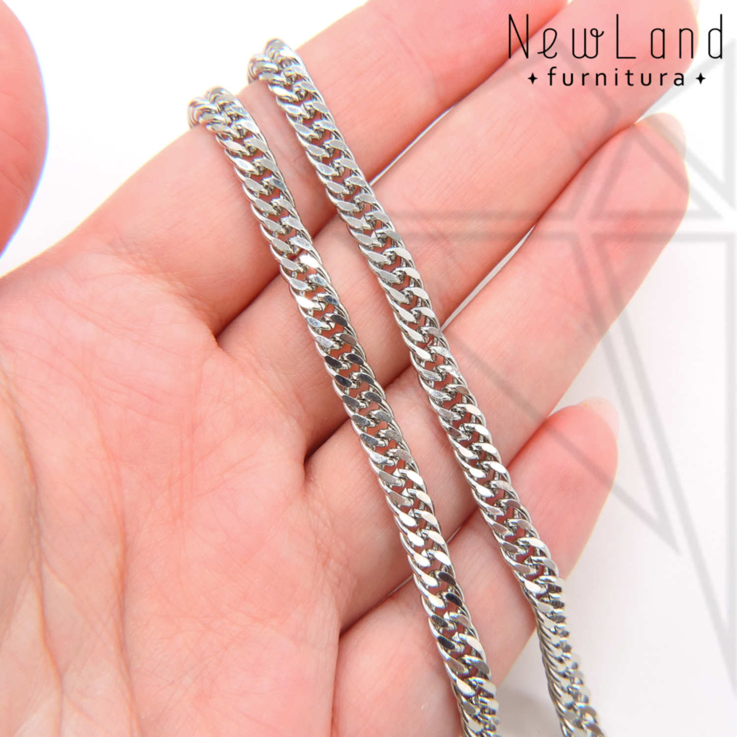 Цепь из ювелирного сплава плотного панцирного плетения с родированным покрытием.